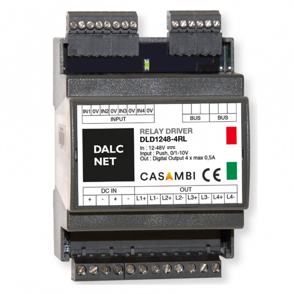 Il Relè Driver con rete CASAMBI è stato concepito per applicazioni professionali che richiedono di pilotare dispositivi come Relè, Teleruttori o altri dispositivi logici. Le uscite possono essere comandate in maniera comoda e semplice dal tuo smartphone grazie all’APP CASAMBI o attraverso i suoi 4 ingressi a pulsante (Normalmente Aperto).