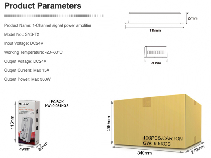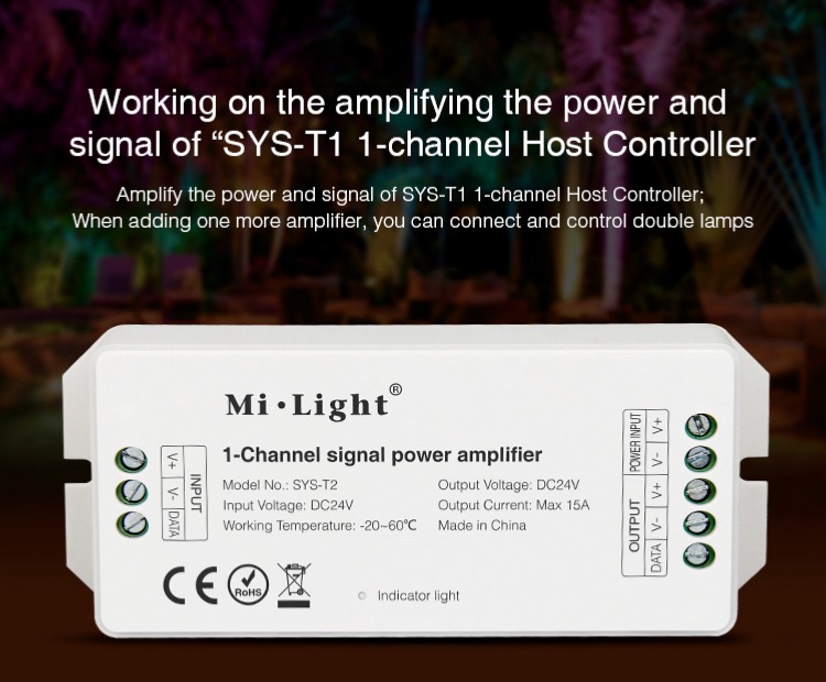 1-Channel Host Controller  Model No.: SYS-T1 Input Voltage: DC24V Working Temperature: -20~60 Output Voltage: DC24V Output Current: Max 15A Output Power: Max 360W Controlling Distance: 30m