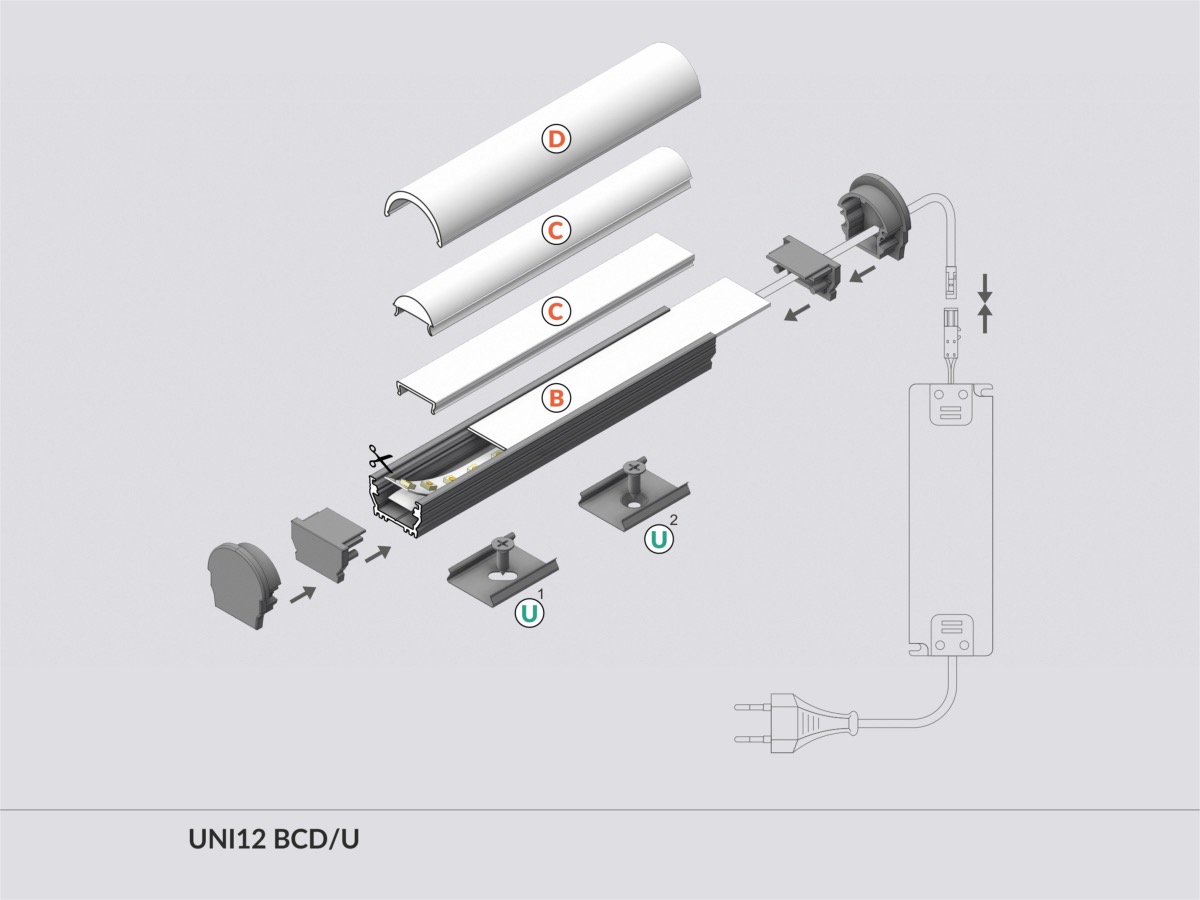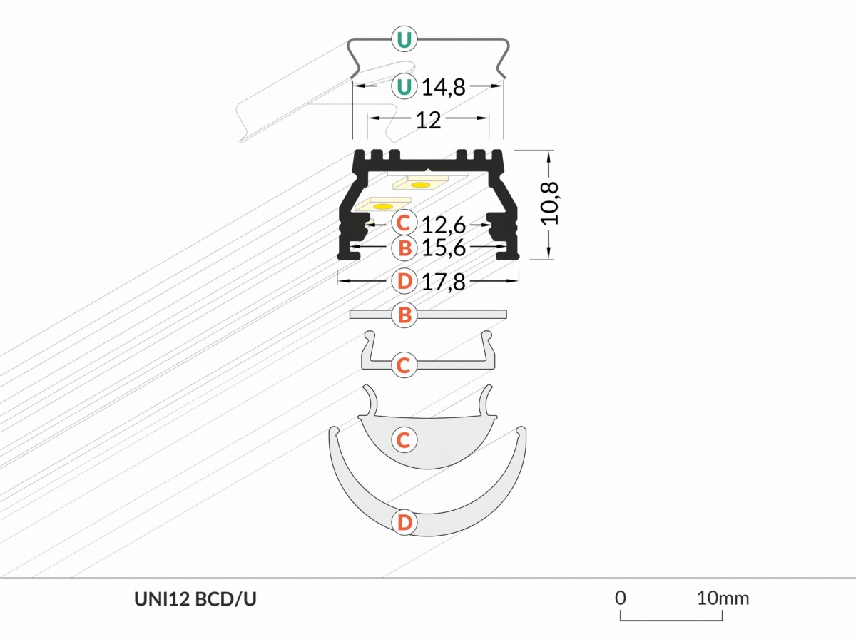 Potenza Dissipabile : Max 26W/Mt Larghezza Max Pcb : 12mm Finitura : Anodizzato Cover : Frosted 90% Colore Tappi : Silver Tipo Ganci : Inox Dimensioni : 17.8 x 10.8 x 1000mm Il Set Comprende: -1 Profilo 1000mm -1 Cover B Frosted 90% 1000mm -2 Tappi Silver -2 Ganci U Inox