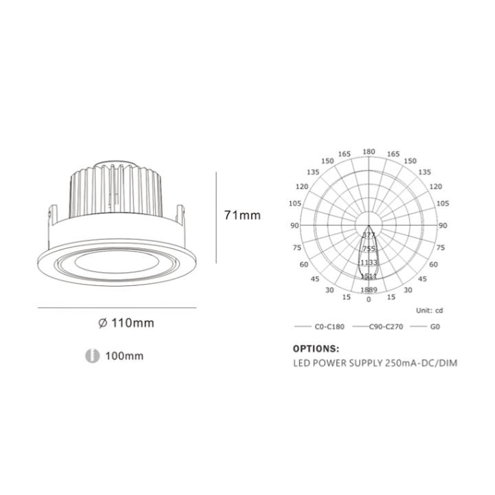 Input: 9.3v 700ma Potenza: 7W Lumen: 500lm Fascio luminoso: 36° Colore: 3000k Dimensioni: 90*60mm foro 45mm Colore: bianco Protezione IP: IP20 Certificati: CE & RoHS Durata: 50.000 Ore Garanzia: 5 Anni
