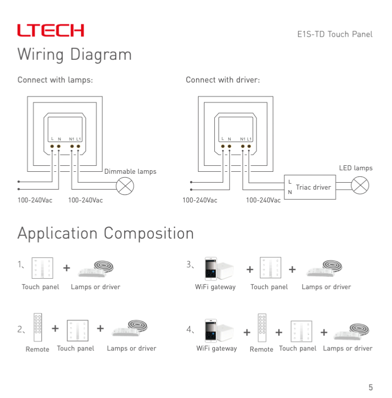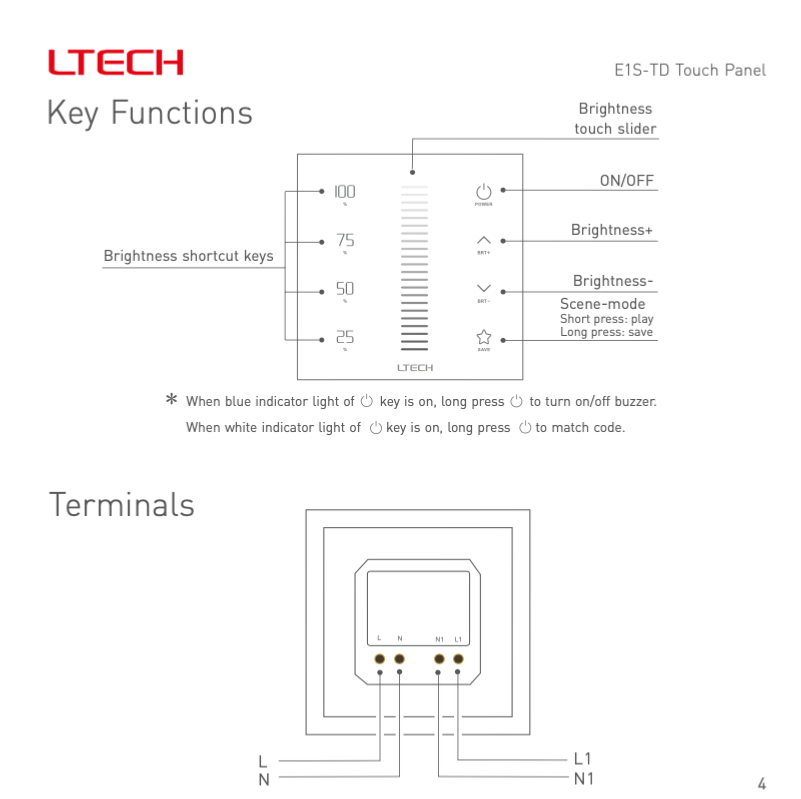 Con questo pannello di controllo a parete è possibile controllare la luce Tradizionale/LED con tipo di dimmerazione Taglio di fase Triac direttamente dall'uscita sul retro del pannello oppure tramite RF utilizzando un Telecomando RF separato. Toccando l'icona della modalità è possibile alternare tra varie impostazioni predefinite .