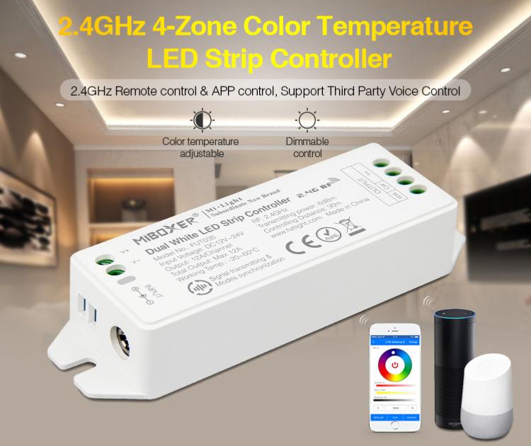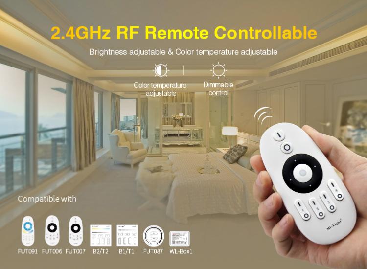 • Tecnologia di trasmissione wireless 2.4G RF • Può controllare i prodotti della serie MiBoxer/Mi-Light 2.4G • Distanza di controllo: 30 m • Temperatura colore e luminosità regolabili • Forte base magnetica Tensione di lavoro: 3V (AAA * 2 PZ) Consumo energetico in standby: 5μA Potenza di trasmissione: 6dBm RF: 2,4 GHz Distanza di controllo: 30 m Frequenza di trasmissione : 2400-2483,5 MHz Metodo di modulazione: GFSK Temperatura di lavoro: -10~40°C Garanzia: 2 anni