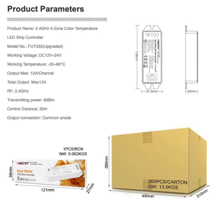 Product Name: 2.4GHz 4 Zone RF CCT Remote Control Model No.: FUT007 Voltage: 3V(sevtion 2 batteries) Transmission Frequency: 2.4GHz Modulation Method: GFSK Transmitting Power: 6dBm Standy Power Consumption: 20uA Control Distance: 30m Size: 110*53*21.5mm Garanzia: 2 anni