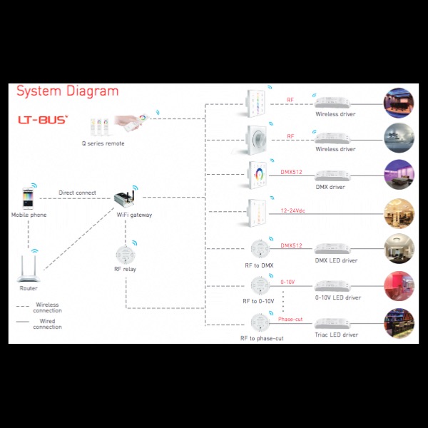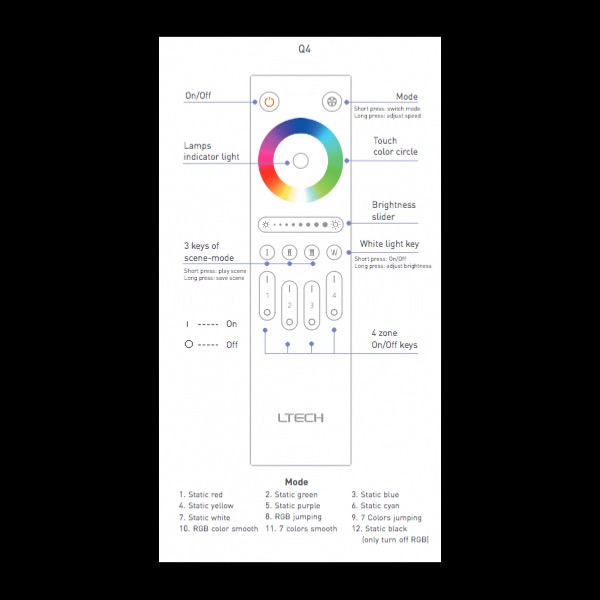 Il telecomando della serie Q è un controllo a 4 zone con attenuazione del cerchio di colori e attenuazione tramite cursore. Il colore e la luminosità vengono visualizzati tramite indicatori di colore. Collegati a qualsiasi driver wireless entro una distanza effettiva e mantieni l'effetto sincronizzato. Funziona con F4-5A, F4-DMX-5A, F5-DMX-4A e pannello touch.
