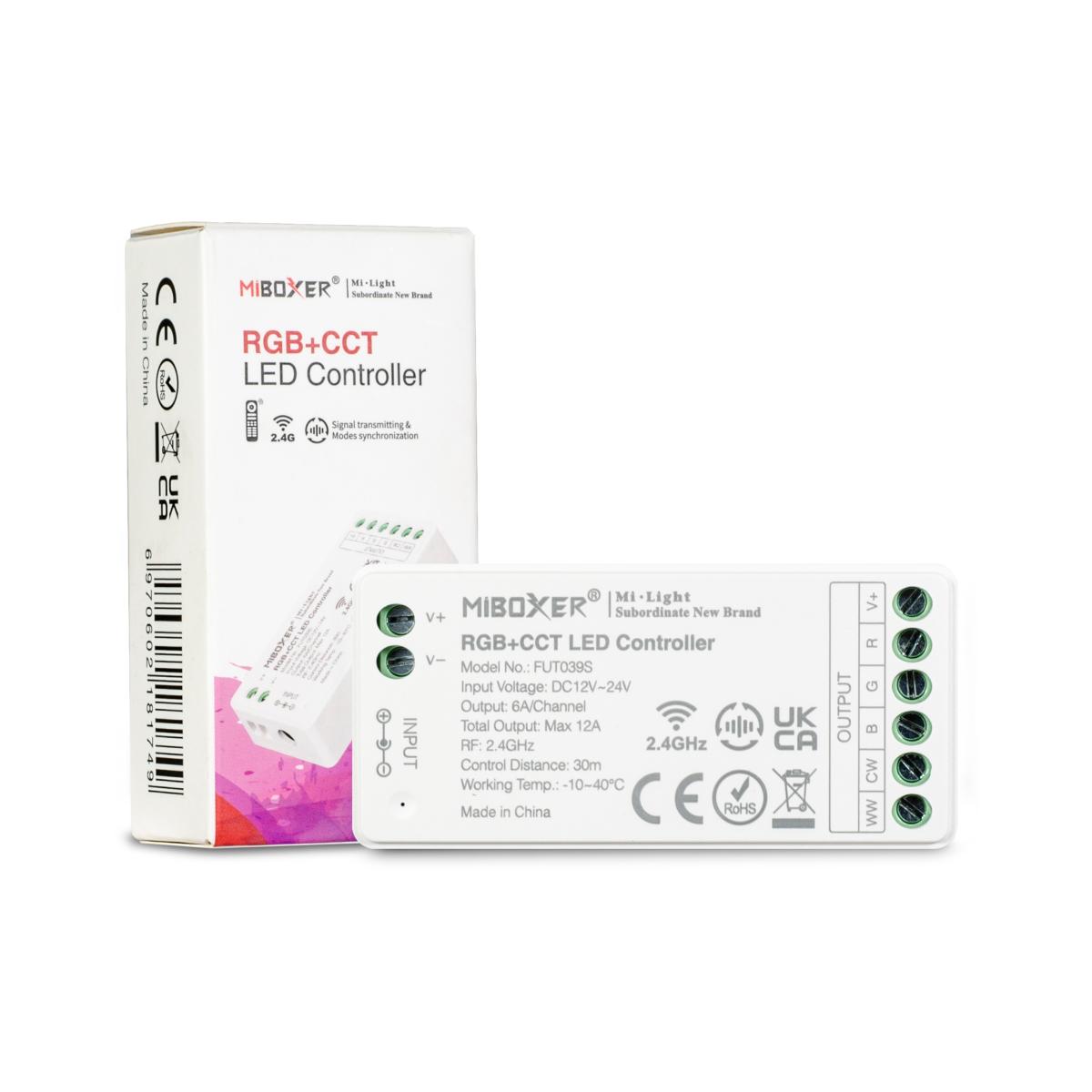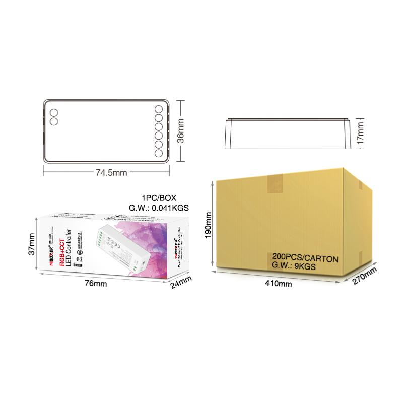 • Tecnologia di trasmissione wireless 2.4G RF • Può controllare i prodotti della serie MiBoxer/Mi-Light 2.4G • Distanza di controllo: 30 m • 16 milioni di colori tra cui scegliere • Luminosità, temperatura colore e saturazione regolabili Tensione di lavoro: 3 V (AAA*2 PZ) Consumo energetico in standby: 15μA Potenza di trasmissione: 6dBm RF: 2,4 GHz Metodo di modulazione: GFSK Distanza di controllo: 30 m Temperatura di lavoro: -10~40°C Certificazione: CE, EMC, RED