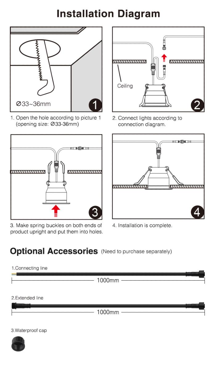 Dimensioni : D.42x36mm ,Foro D.35mm , Cavo 360mm con spinotto IP66