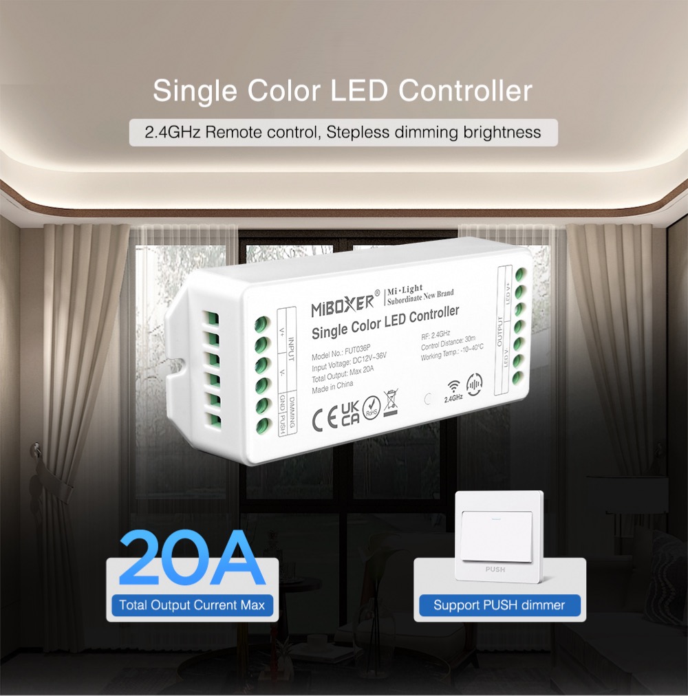 Modello.: FUT035S+ Voltaggio: DC12V-24V Output : Max. 12A/CH , Totale Max.12A Distanza Controllo : 30m Dimensioni : 74.5x36x17mm Caratteristiche : -Gestione 2 IN 1 : singolo colore o CCT - Estensione segnale RF 2.4G - Switch PWM Alta Frequenza / Bassa Frequenza - PUSH Dimming compatibili -Memoria -Modalità "no disturb" dopo black out gestibile da telecomando ( default attivo) -Garanzia: 2 anni