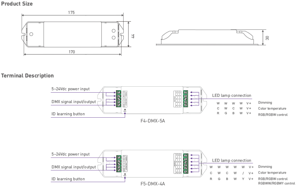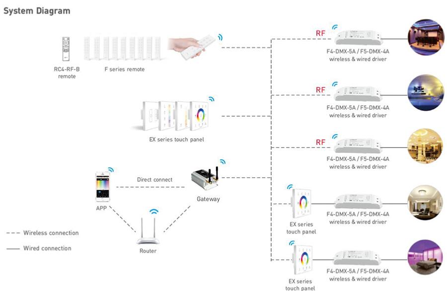 Questo prodotto supporta due modalità di cablaggio: connessione wireless RF a 2,4 GHz e connessione cablata DMX. Funziona con WiFi-106, gateway intelligente, pannello serie EX, telecomando serie F e telecomando RC4-RF-B ecc.