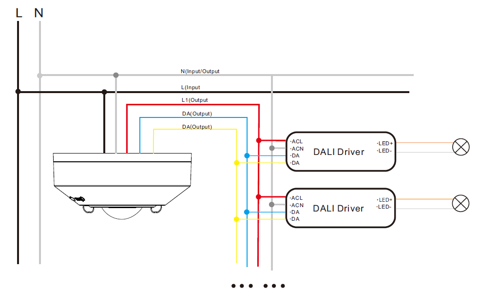 Il sensore può funzionare con driver o apparecchi di illuminazione LED DALI: gli apparecchi devono semplicemente essere collegati all’alimentazione di rete.